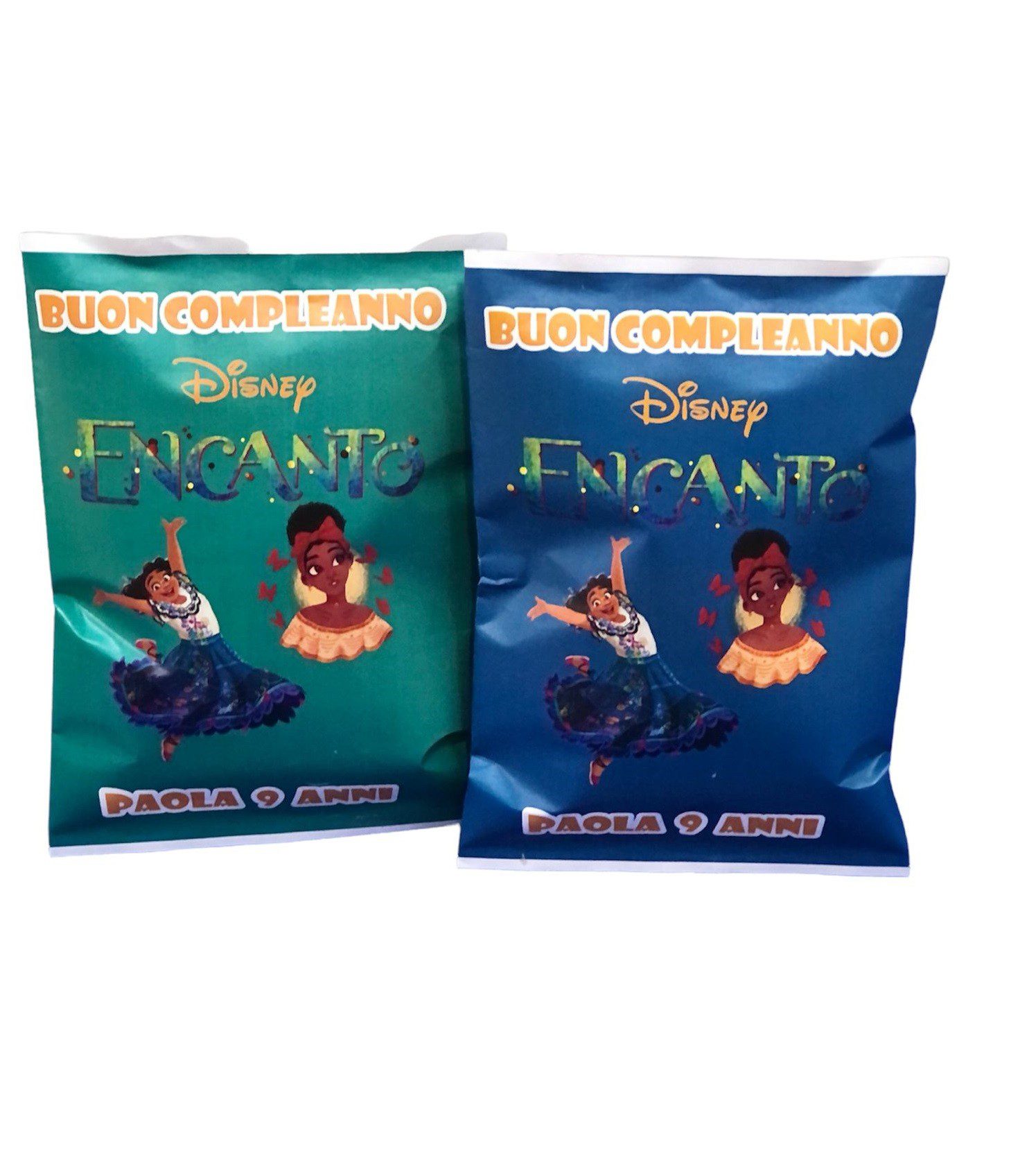 10 sacchetti di snack da 25g o 50g, personalizzati con il nome e l’età del/la festeggiato/a su etichetta colorata, perfetti per una festa ispirata al magico mondo di Encanto!