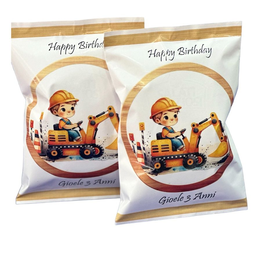 Ogni bustina può essere personalizzata con il nome del festeggiato,l’età e una grafica divertente e colorata con escavatori e macchinari da cantiere, ideali per feste di compleanno a tema costruzioni o per gli amanti dei mezzi da lavoro.