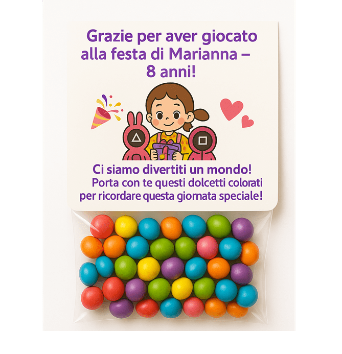 Un simpatico gadget di fine festa per sorprendere tutti gli invitati! Bustina trasparente con confetti colorati e una card personalizzata a tema Squid Game, con il nome del festeggiato e l’età. Perfetto per rendere la festa ancora più memorabile e divertente!