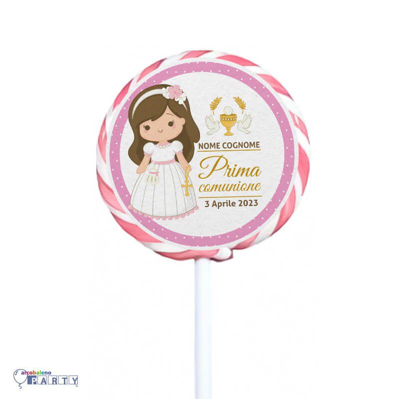 10 Lecca Lecca Comunione Girandola Colore Rosa gr 50 con bollino Personalizzato Nome e Data Evento