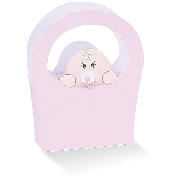 10 SCATOLE PORTACONFETTI BORSA CON BIMBA CON TESTA FUORI ROSA