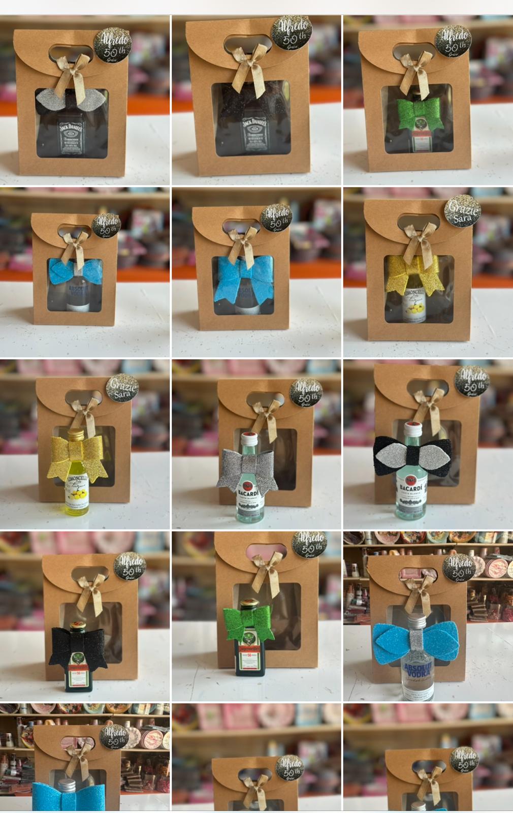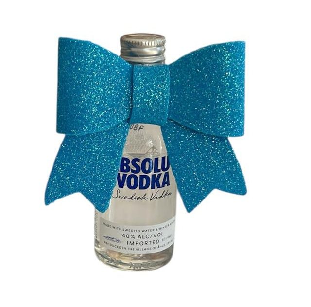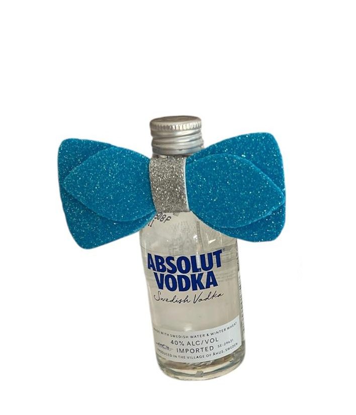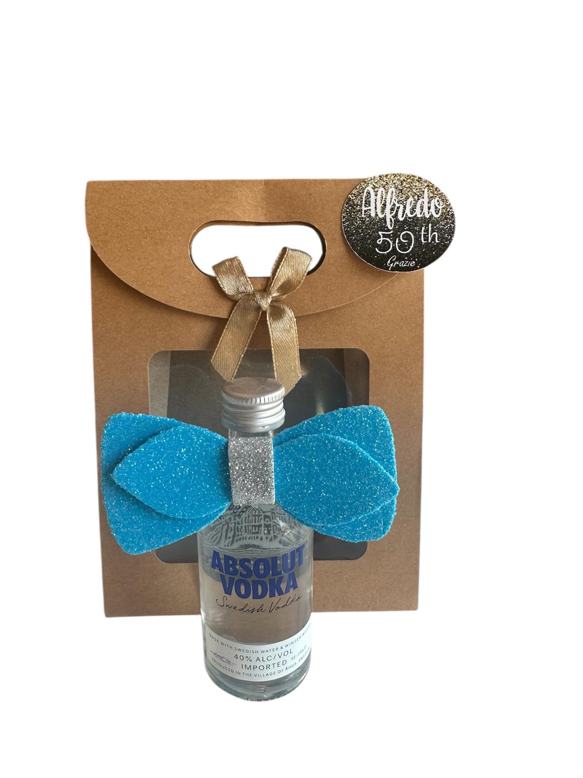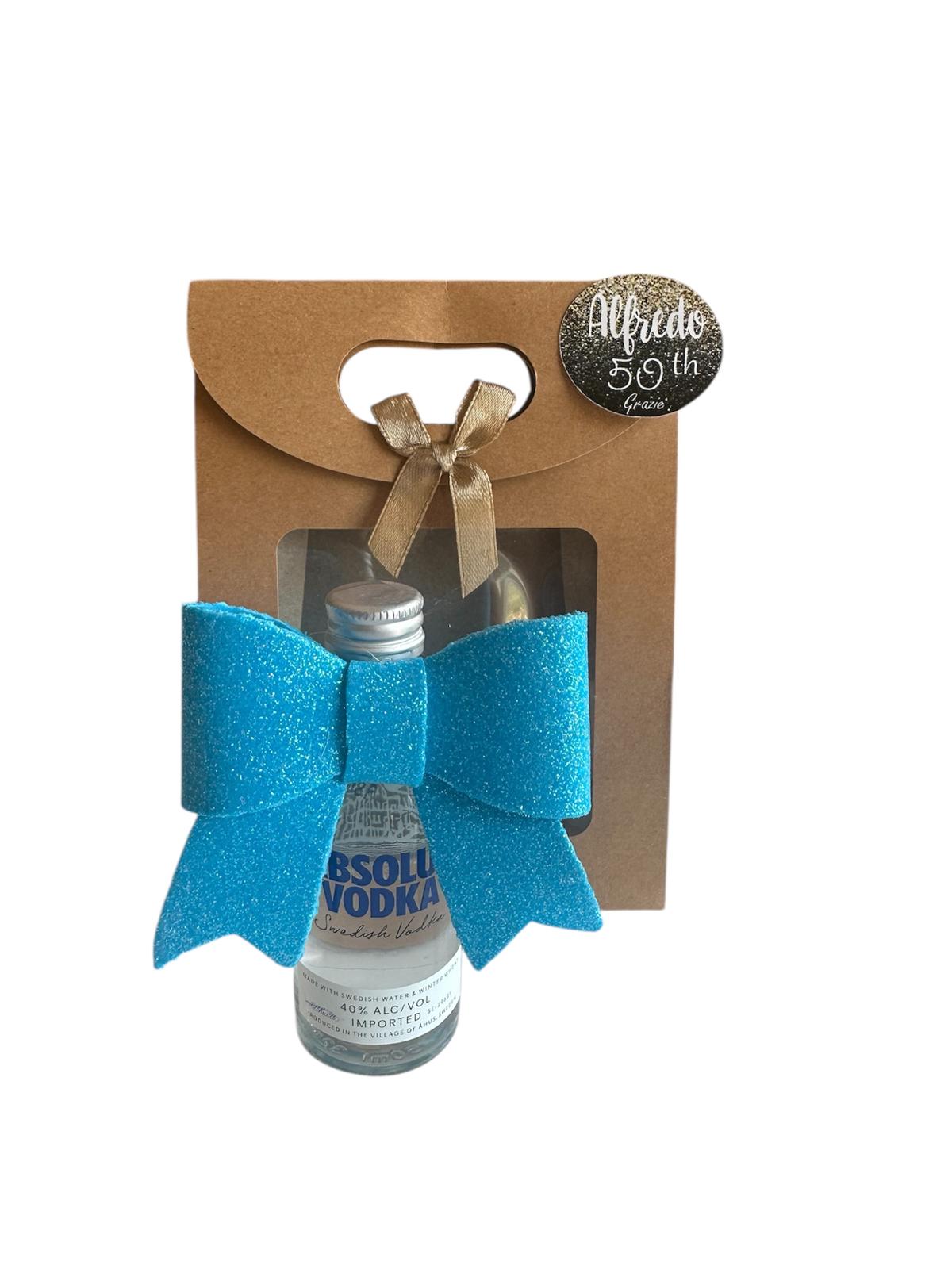 ✨ Eleganti confezioni in kraft con mini bottiglia di Absolut Vodka 5cl, decorate con fiocco glitter o papilon glitterato e targhetta personalizzata.