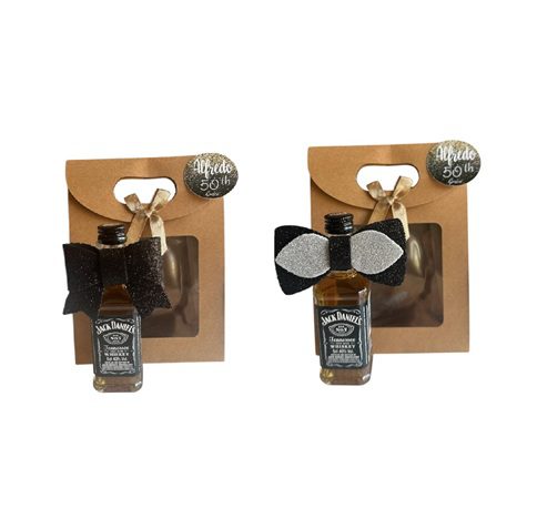 ✨ Eleganti confezioni in kraft con mini bottiglia di Jack Daniel’s 5cl, decorate con fiocco glitter o papilon glitterato e targhetta personalizzata.