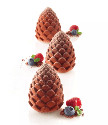 Scopri la linea 3D Fruits! Anche le foreste nascondono dei tesori preziosi: le pigne. Si tratta di preziosi gusci che possono svelare inaspettate golosità. E’ stata questa l’ispirazione per realizzare Foresta di Silikomart Professional. Una nuova interpretazione del mondo dei dessert attraverso una forma che è un ritorno alle origini, alla natura, alla riscoperta di sapori armonici e perfetti. Una base in plastica fa da supporto ad uno stampo in silicone a 5 cavità in cui potrete creare nuove golosità da porzione finalmente in 3D.