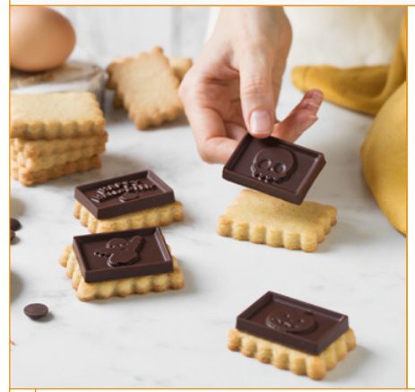 Mescola in una ciotola la farina con il burro freddo tagliato a pezzetti. Unisci lo zucchero a velo el’uovo. Aggiungi un pizzico di sale e lavora velocemente l’impasto con le mani fino ad ottenere unpanetto liscio ed omogeneo. Lascia riposare in frigo per un’ora. Stendi l’impasto con il mattarellosu un piano leggermente infarinato. I biscotti dovranno avere lo spessore di circa 5 mm. Con laplacca tagliapasta ritaglia le sagome e cuocile in forno statico a 180° C per circa 12 minuti. Lasciaraffreddare e nel frattempo prepara le tavolette di cioccolato. Sciogli il cioccolato a bagnomariamescolando accuratamente. Utilizzando il termometro digitale, assicurati che la temperaturaarrivi a circa 29°-30° C. Riempi le cavità dello stampo con il cioccolato fuso e lascia raffreddare.Quando si sarà solidificato sforma le tavolette dallo stampo e posizionale sui biscotti utilizzandodel cioccolato fuso.