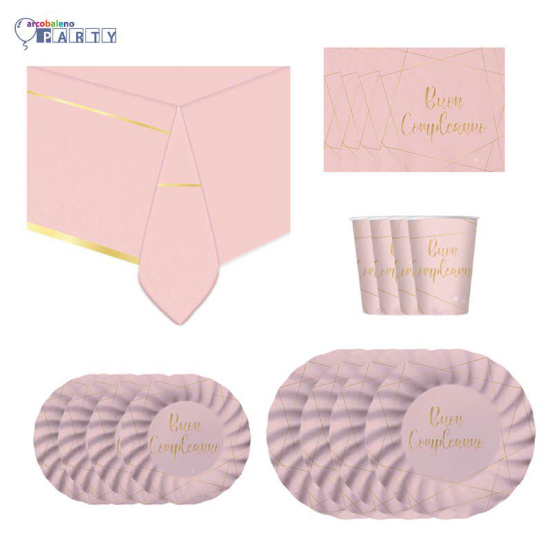 KIT 16 OSPITI COORDINATO TAVOLA CON TOVAGLIA ROSE BUON COMPLEANNO ( 32 piatti,16 bicchieri,40 tovaglioli 1 tovaglia)