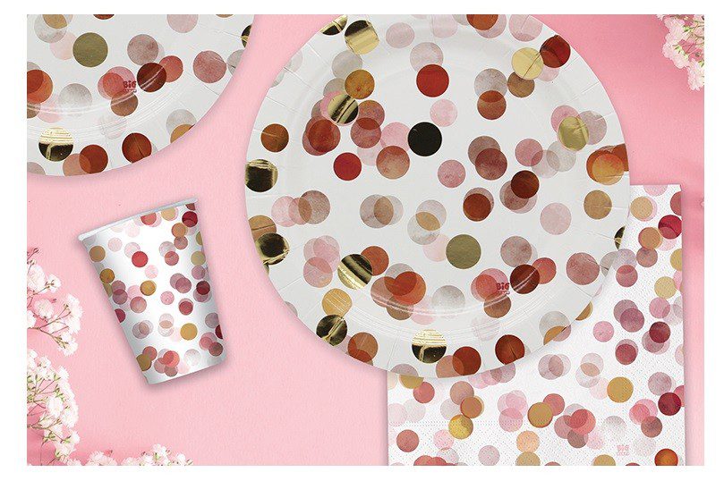 KIT 16 OSPITI POIS CHIC ROSA GOLD ORO COORDINATO TAVOLA (16 PIATTI, 16 BICCHIERI,20 TOVAGLIOLI) CORIANDOLI