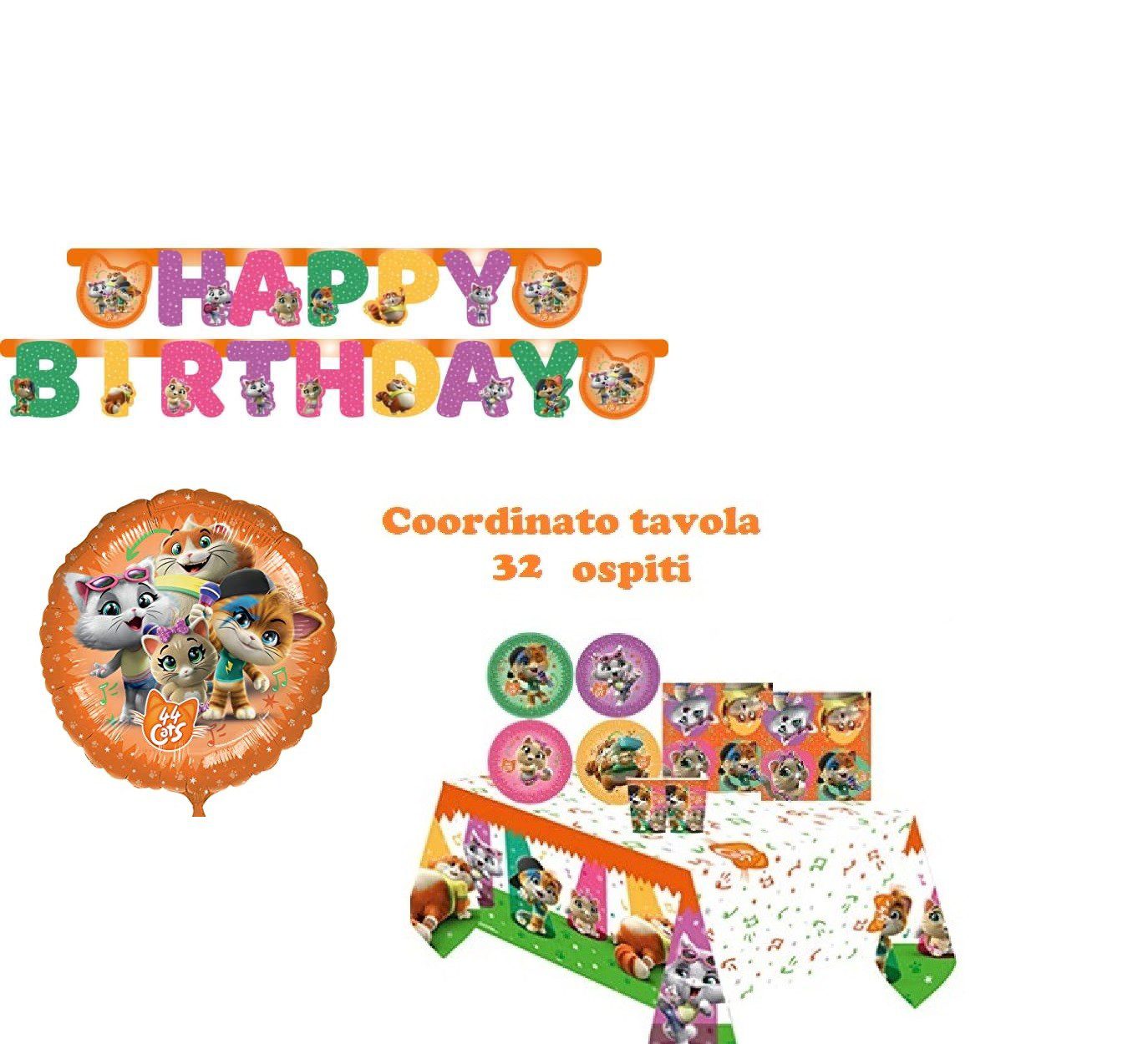 Coordinato tavola 44 gatti 32 Ospiti:32 Piatti,32 Bicchieri,40 Tovaglioli,1 Tovaglia 44 gatti,1 FESTONE, 1 PALLONE IN FOIL