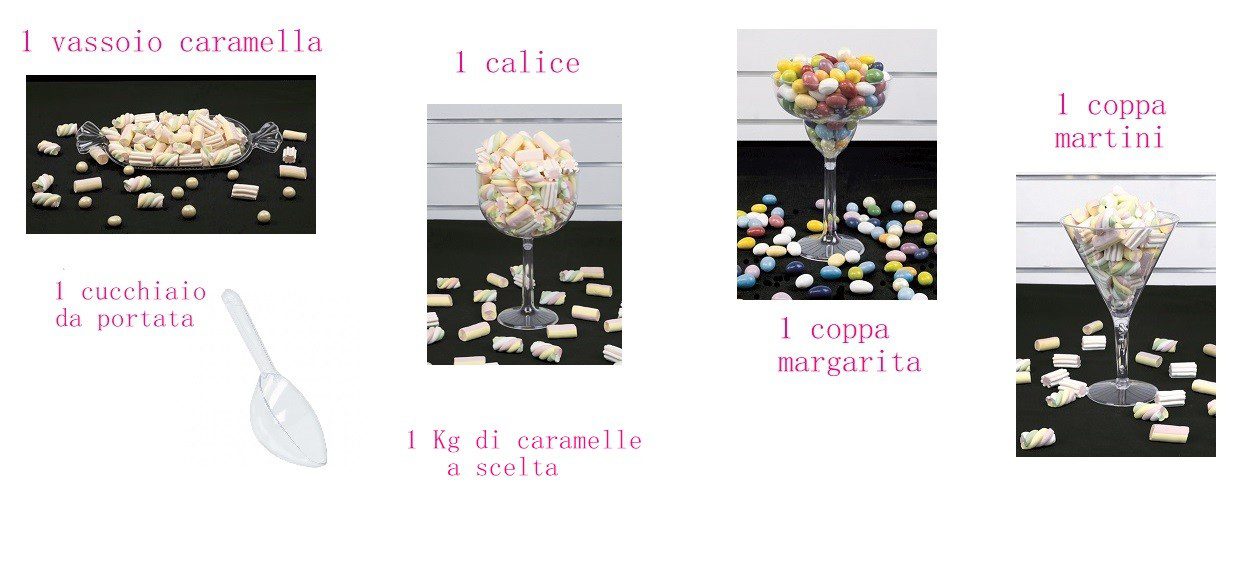 KIT 4 COPPE PER CARAMELLATA CON 1 KG DI CARAMELLE E 1 CUCCHIAIO DA PORTATA