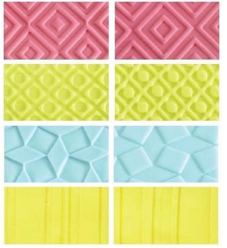 Kit 4 fogli decorativi Decora, effetto motivi geometrici Sono 4 fogli trasparenti in plastica per alimenti per creare effetti realistici su pasta di gomma e fondente. Dimensioni cm 21 x 29,7