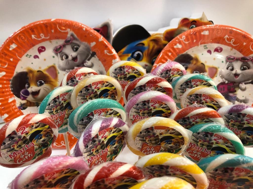 KIT 44 GATTI CON TORTA SCENOGRAFICA E KIT LECCA LECCA CON BASE E BOLLINO PERSONALIZZATI