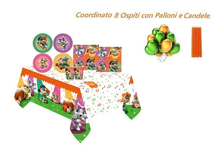 Kit Festa 8 Ospiti 44 Gatti con Candele E PALLONI (8 Piatti,8 Bicchieri,20 TOVAGLIOLI,1 TOVAGLIA,12 Candele,10 PALLONI)