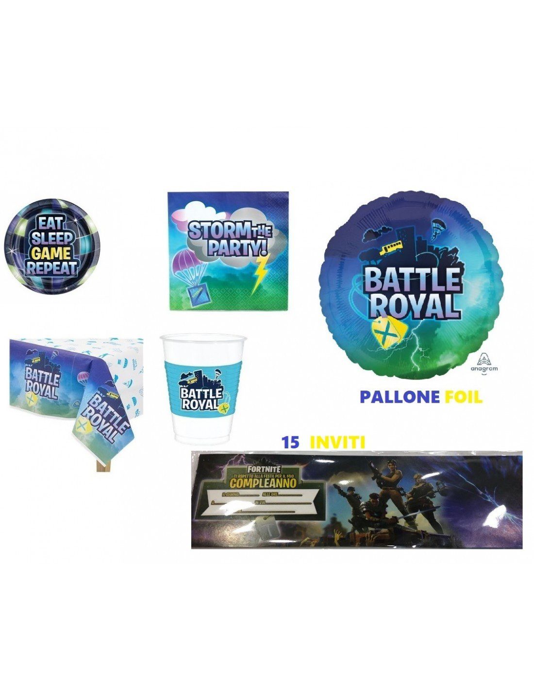 KIT 8 OSPITI FORTNITE BATTLE ROYAL CON, PALLONE FOIL E 15 INVITI COORDINATO TAVOLA