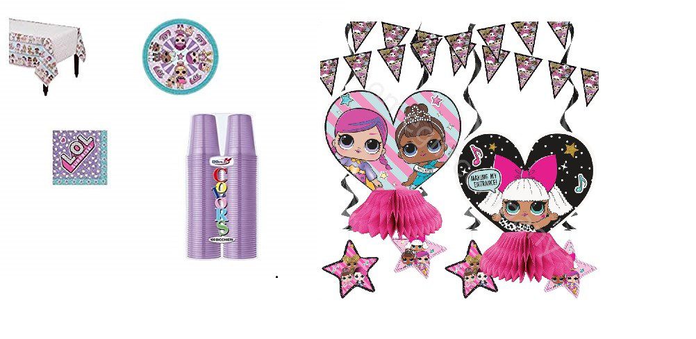 KIT 8 OSPITI LOL SURPRISE CON SET DECORAZIONE TAVOLO 7 PEZZI(8 PIATTI-100 BICCHIERI TINTA UNITA-16 TOVAGLIOLI-1 TOVAGLIA-1 SET DECORAZIONI 7 PEZZI)