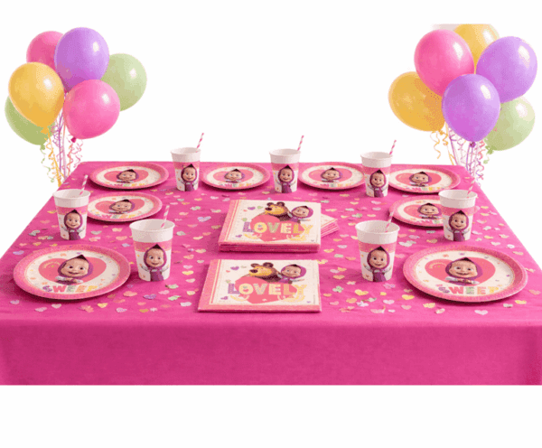 Coordinato Tavola Masha e Orso per 16 ospiti, ideale per feste di compleanno e party a tema bambini.