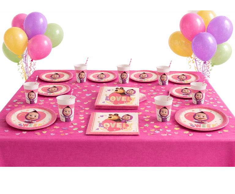Include piatti, bicchieri e tovaglioli con grafiche colorate e allegre di Masha e Orsoe 1 tovaglia a tinta unita perfetti per una tavola pratica, ordinata e super festosa.