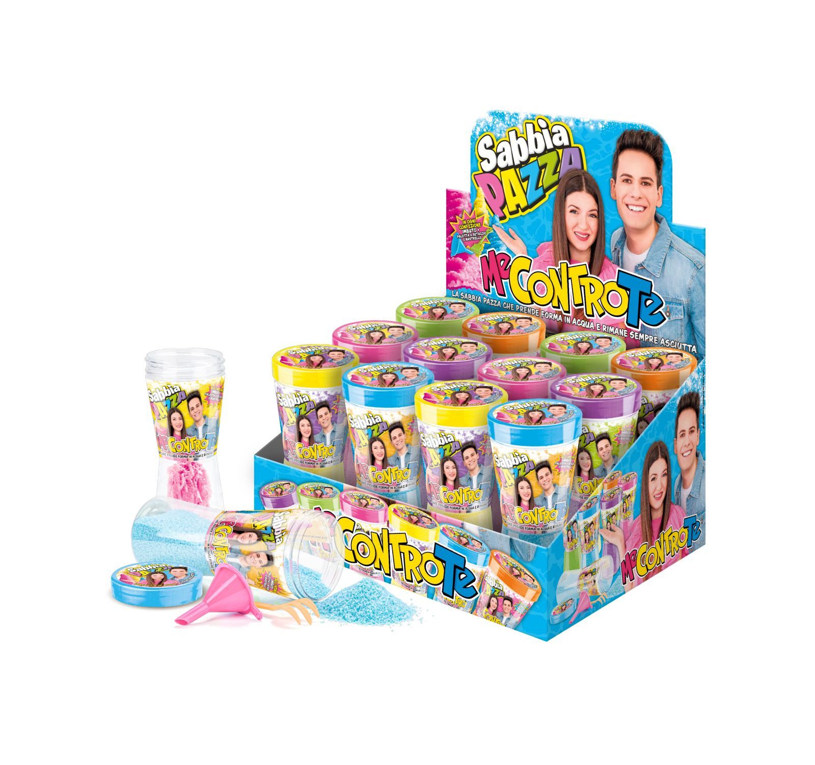 Disponibile in 6 diversi colori, ogni confezione contiene 150 gr. di sabbia pazza, un imbuto e un accessorio assortito (paletta, setaccio o rastrello).