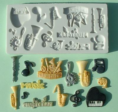 stampo in silicone con 14 diverse forme con tema musica e strumenti musicali.
