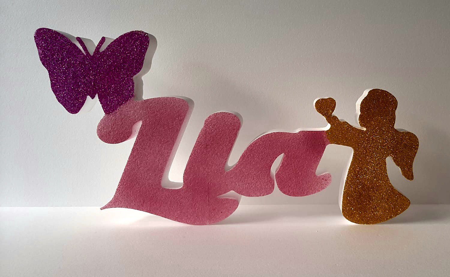 STREPITOSO NOME IN POLISTIROLO CON DECORO FARFALLA E ANGIOLETTO GLITTERATI