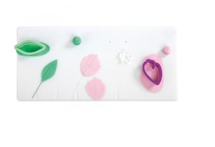 Prodotto Piano di lavoro in materiale plastico adatto al contatto con alimenti ed antiaderente. le 5 incisioni laterali permettono di inserire i fili di ferro nei petali e nelle foglie realizzate in pasta di gomma. i forellini servono a dare forma a fiori e calici. la superficie liscia È perfetta per stendere, lavorare e tagliare la pasta di gomma.