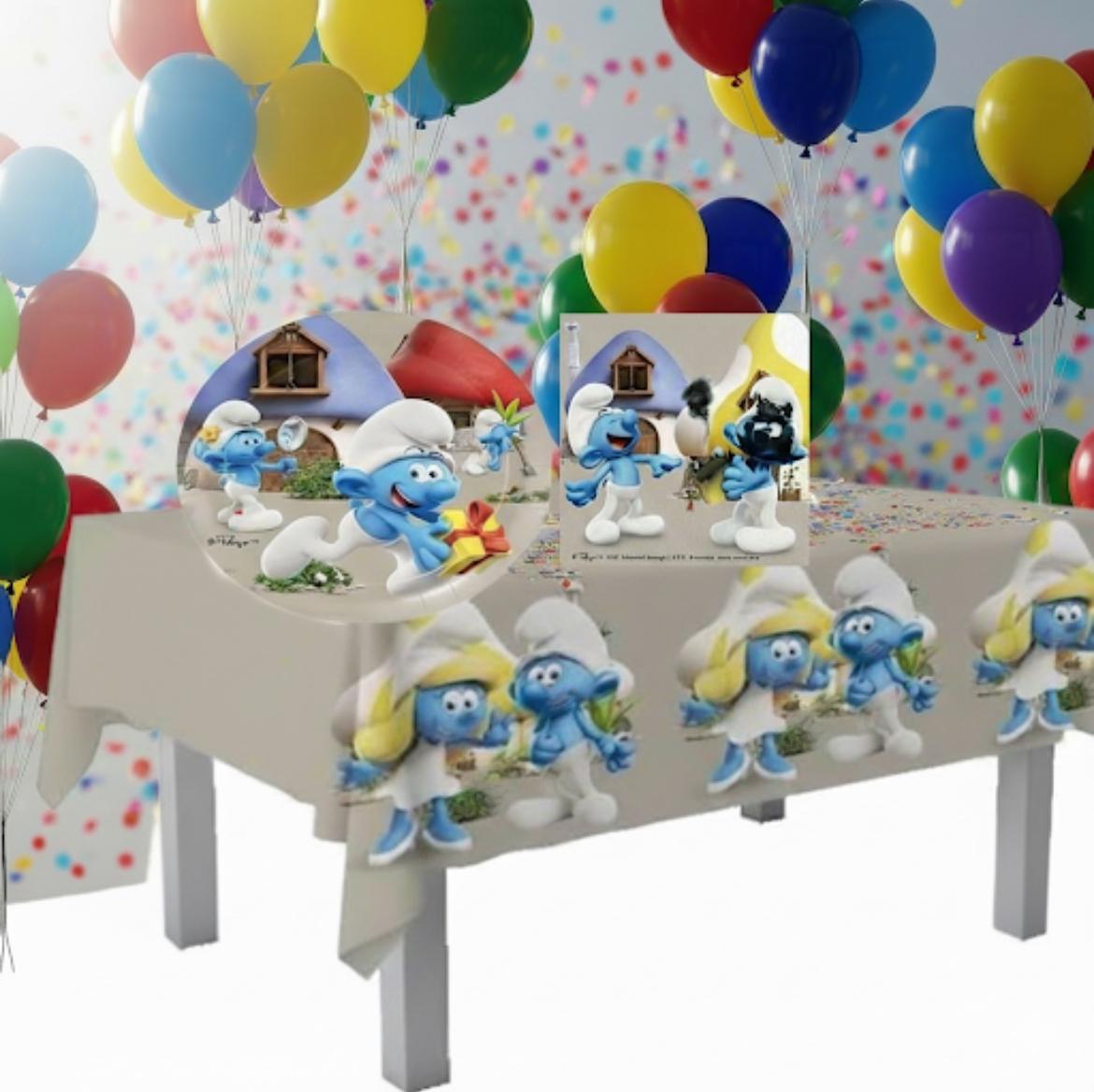 🎉 Coordinato tavola Puffi per 16 ospiti: 16 piatti, 16 bicchieri, 20 tovaglioli e 1 tovaglia in plastica resistente. Perfetto per feste allegre e colorate! 💙