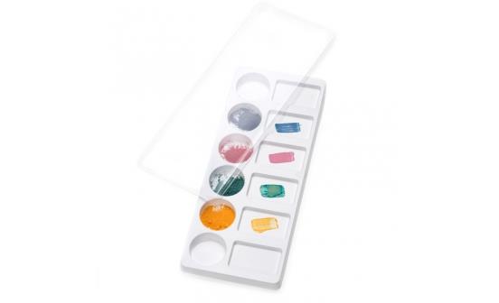 Tavolozza in plastica per miscelare o diluire colori in polvere e in gel. dispone di 6 cavità tonde per contenere il colore da attingere con il pennello e di 6 cavità rettangolari ideate per scaricare il colore dal pennello per raggiungere l’intensità desiderata.