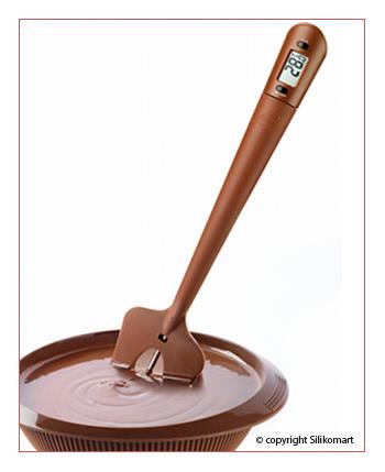 Thermo Choc, della linea Easy Choc, la stampola in silicone con termometro per il controllo della temperatura (da 0 C a 200 C) di cioccolato fuso, creme, salse, marmellate, sciroppi, meringa all’italiana, ecc.