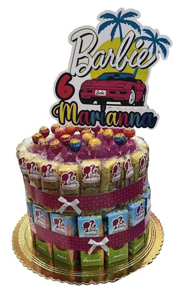 Torta di merendine e succhi con topper personalizzato tema Barbie