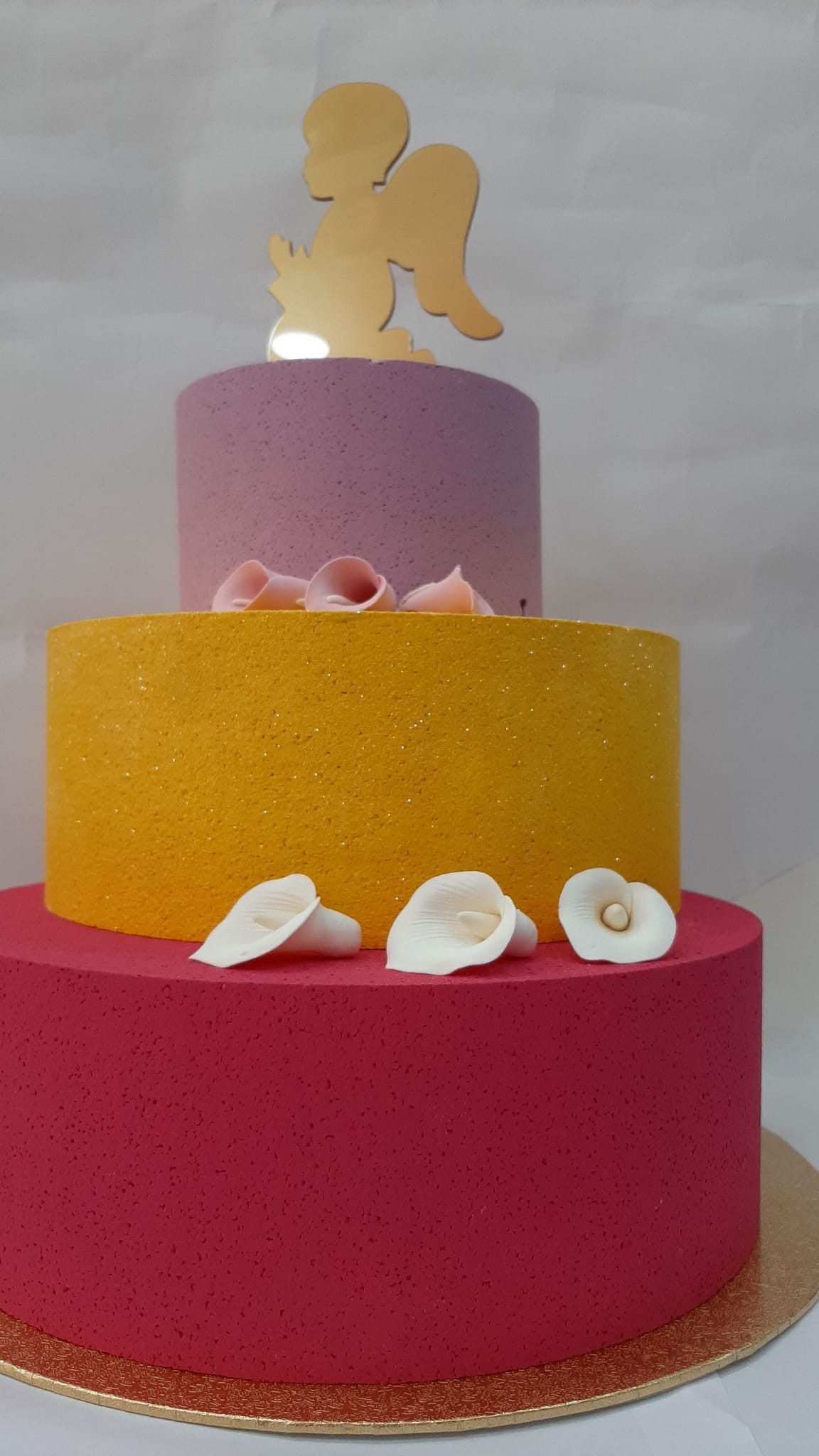 Torta scenografica in politirolo colorato a 3 piani con topper in plex colore oro e decorazioni in zucchero