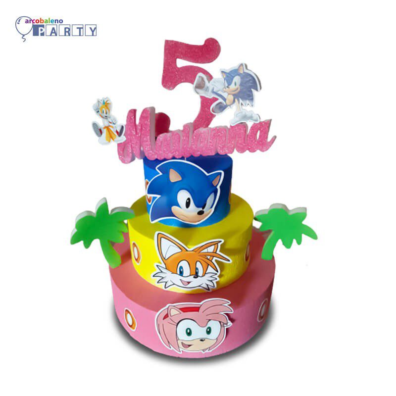 TORTA SCENOGRAFICA TEMA SONIC CON TOPPER E NUMERO PERSONALIZZATO IN POLISTIROLO COLORATO 3 PIANI